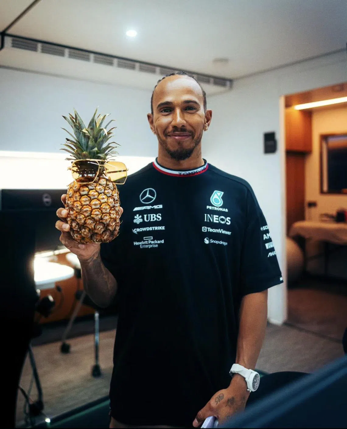 Lewis Hamilton posing with a pineapple, in a likely ode to the Republic’s president elect Tharman Shanmugaratnam, who had used the tropical fruit as his campaign symbol during the election.