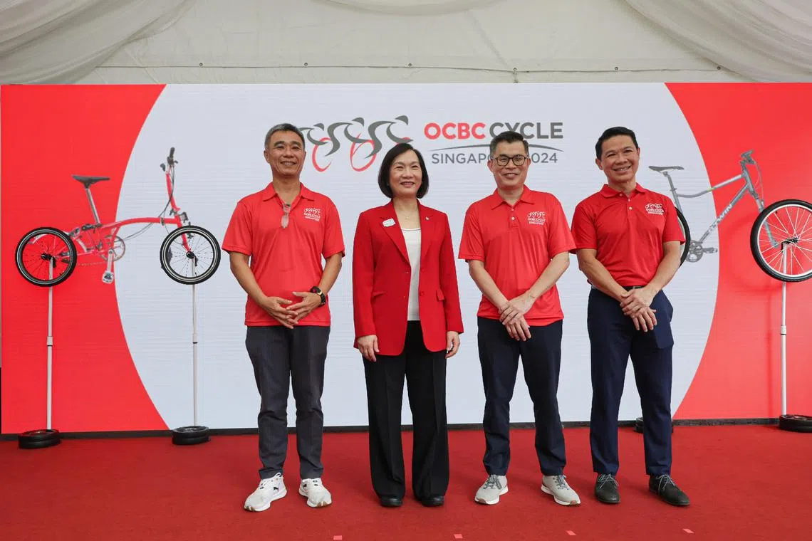 (From left) Toh Boon Yi, deputy CEO of Sport Singapore, Helen Wong, group CEO of OCBC, Jaime Ho, editor of The Straits Times and Hing Siong Chen, president of Singapore Cycling Federation at the official launch of OCBC Cycle Singapore at Orchard Gateway on Mar 5, 2024.