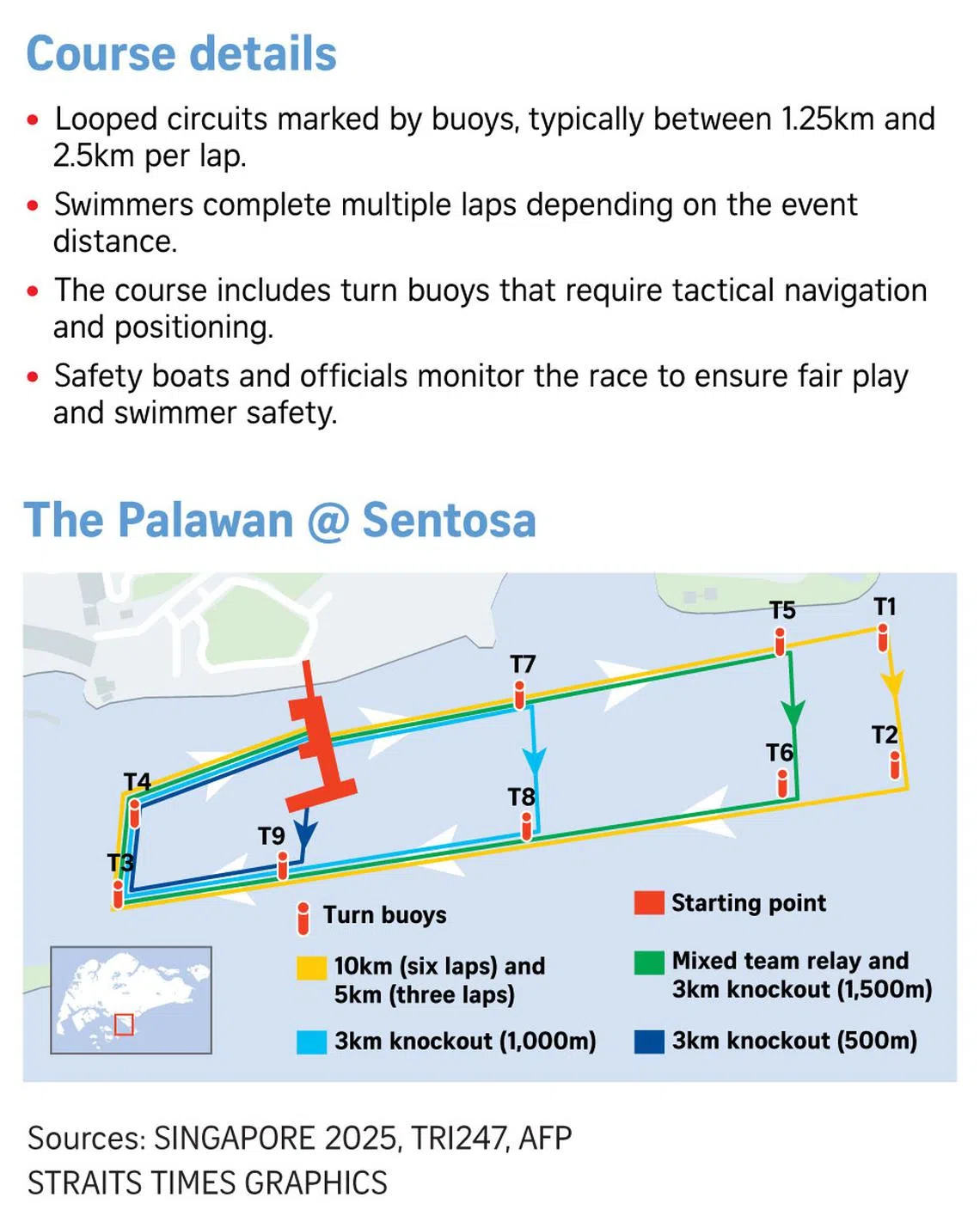 Other contenders in Singapore are France’s Marc-Antoine Olivier, the 2024 world silver medallist who leads the World Aquatics Open Water Swimming World Cup standings in 2025 after claiming the 10km gold and 3km knockout sprint bronze in Setubal, Portugal and bronzes in Ibiza, Spain and Egypt.