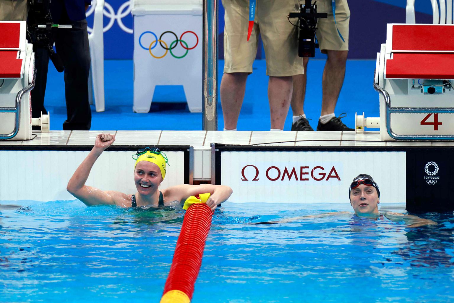 Ariarne Titmus (left) and Katie Ledecky in the women's 400m freestyle final at the Tokyo Aquatics Centre on July 26, 2021.