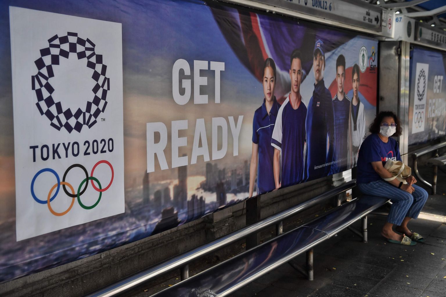 A woman wears a face mask as she sits at a bus stop advertising the Tokyo 2020 Summer Olympics in Bangkok.