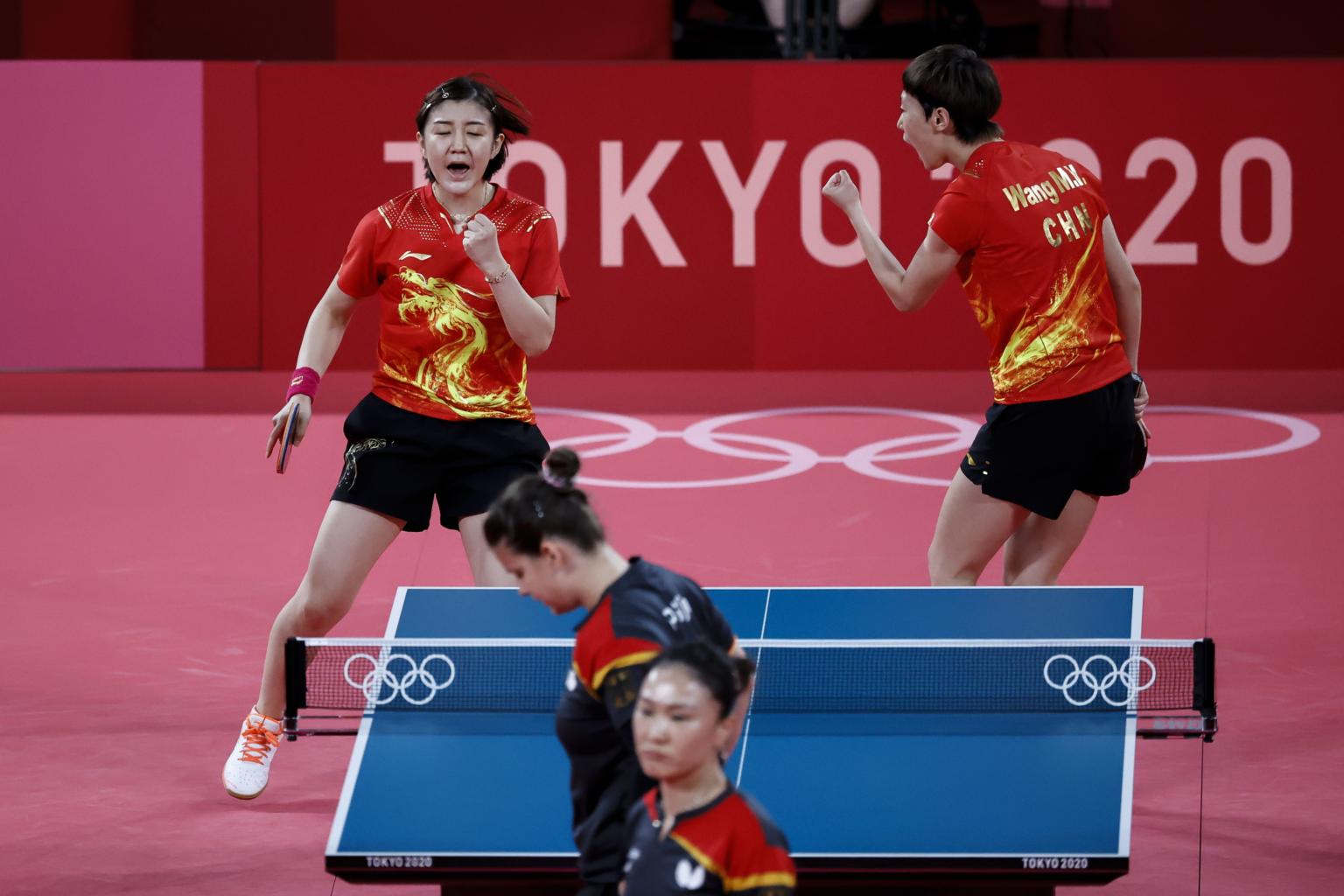 Wang Manyu (right) and Chen Meng react during the Table Tennis Women's team semifinal match on Aug 4, 2021.