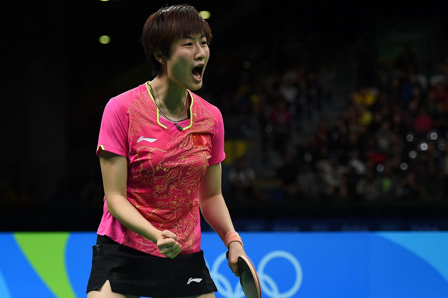 China's Ding Ning celebrates after winning the gold medal in the women's singles table tennis final.