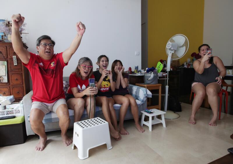 Jonathan Chan's dad Kenneth and mum Foo Yan Nuen, sisters Kimberly and Colette and cousin Roxanne Foo watching his dives on TV in Singapore.