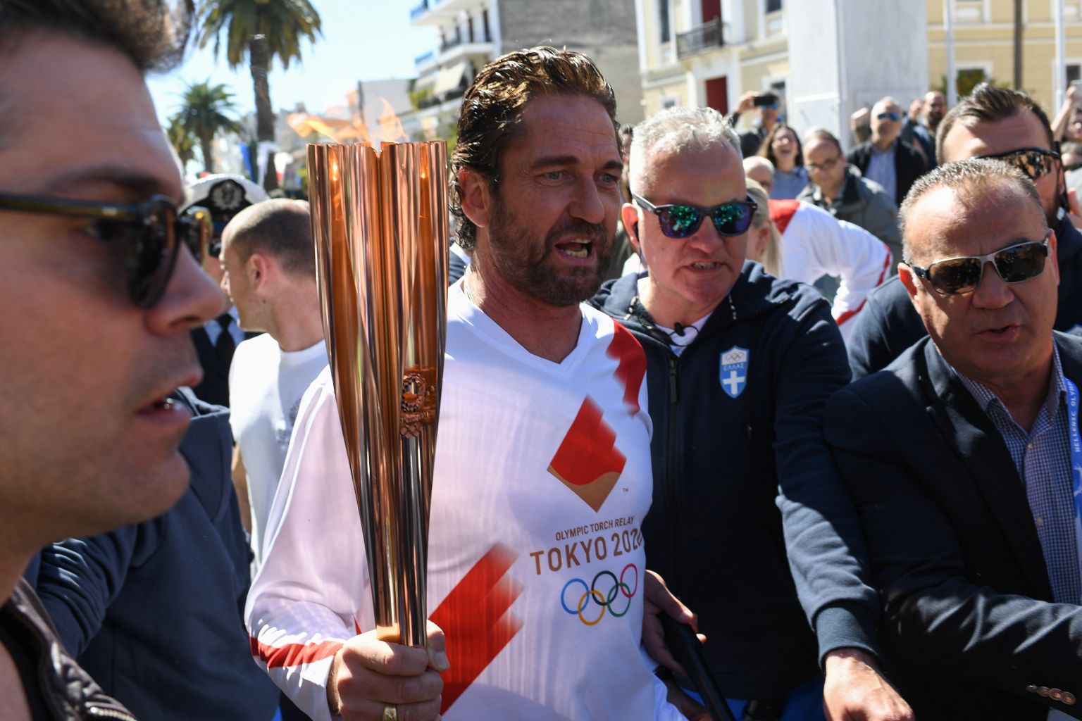 US actor Gerard Butler takes part in the Olympic flame torch relay for the Tokyo 2020 Summer Olympics.