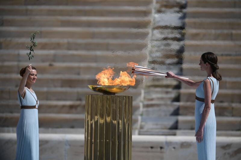 In the absence of spectators, Olympic gymnastics champion Lefteris Petrounias ran a lap with the flame and Olympic pole vault champion Katerina Stefanidi lit a cauldron inside the all-marble Panathenaic stadium, where the first modern Olympics were held in 1896.
