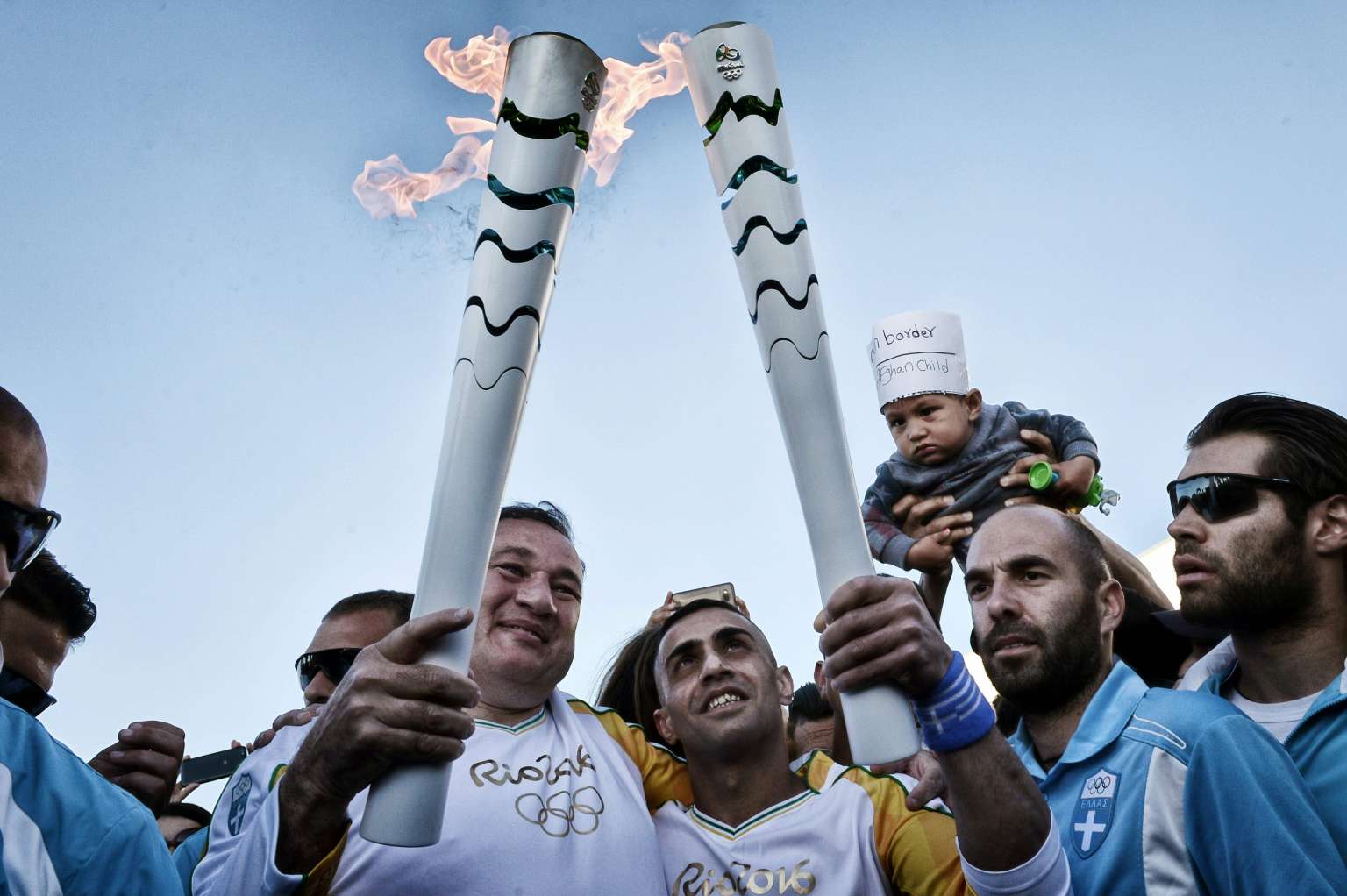 The Olympic flame being handed to Syrian refugee Ibrahim al-Hussein (centre), an amputee swimmer, at a refugee camp in Athens on April 26, 2016.
