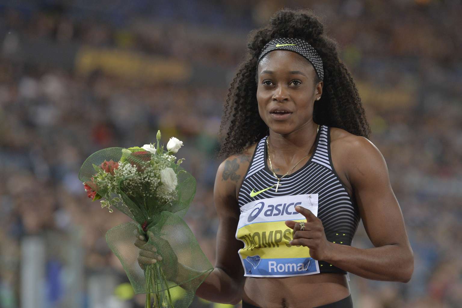 Jamaica's Elaine Thompson celebrates after winning the women's 100m event at the Rome's Diamond League competition on June 2, 2016, in Rome.