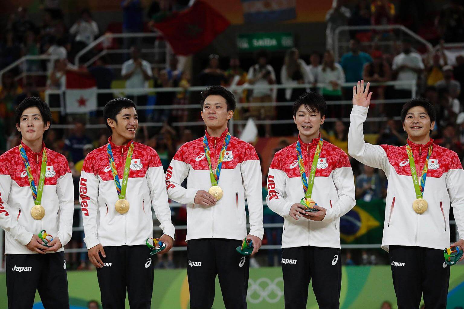 (From left) Japan's Ryohei Kato, Kenzo Shirai, Yusuke Tanaka, Kohei Uchimura and Koji Yamamuro pose with their gold medals on the podium for the Men's Team final of the Rio 2016 Olympic Games Artistic Gymnastics event.