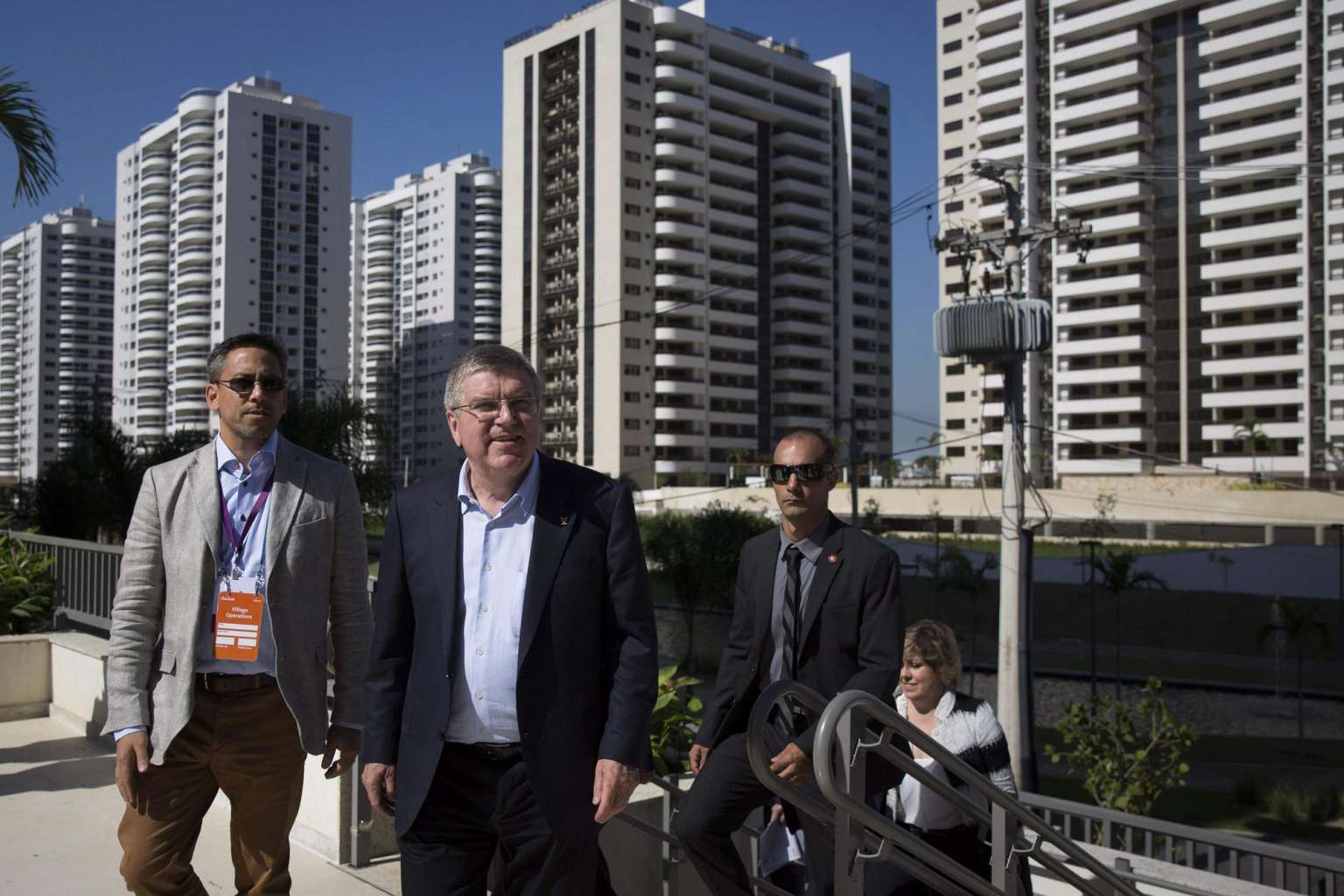 President of the International Olympic Committee (IOC) Thomas Bach (centre) after the inauguration of the Olympic Village in Rio de Janeiro, Brazil, on June 15, 2016.