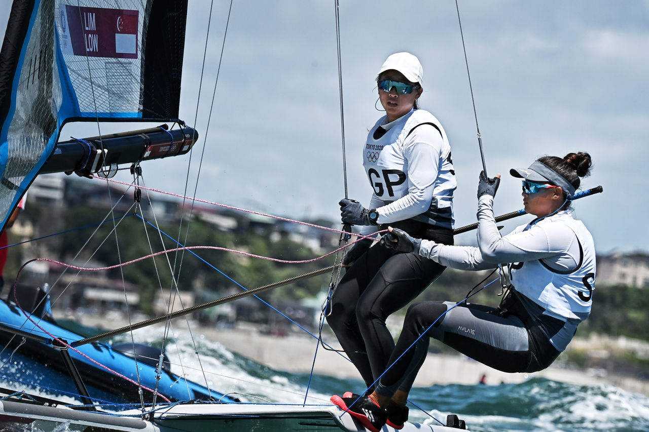 Singapore sailors Kimberly Lim (left) and Cecilia Low finished 10th at the Tokyo Olympics in the 49erFX class at the Tokyo Olympics on Aug 3, 2021.