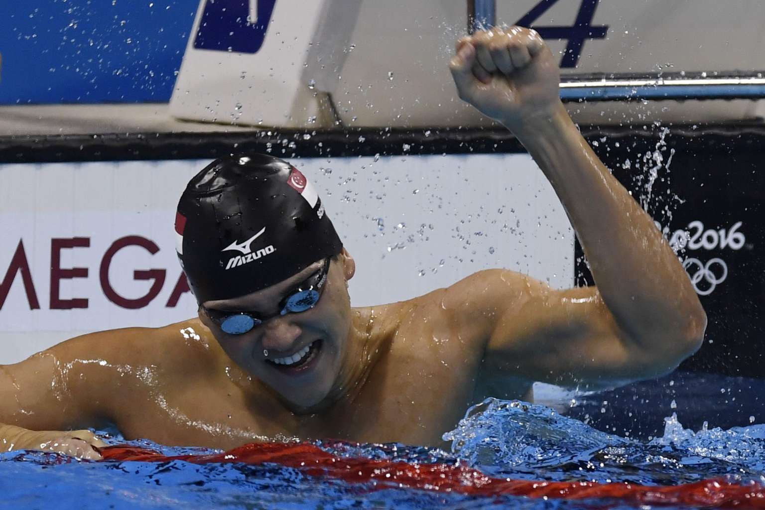 Joseph Schooling celebrating after winning the 100m butterfly final.