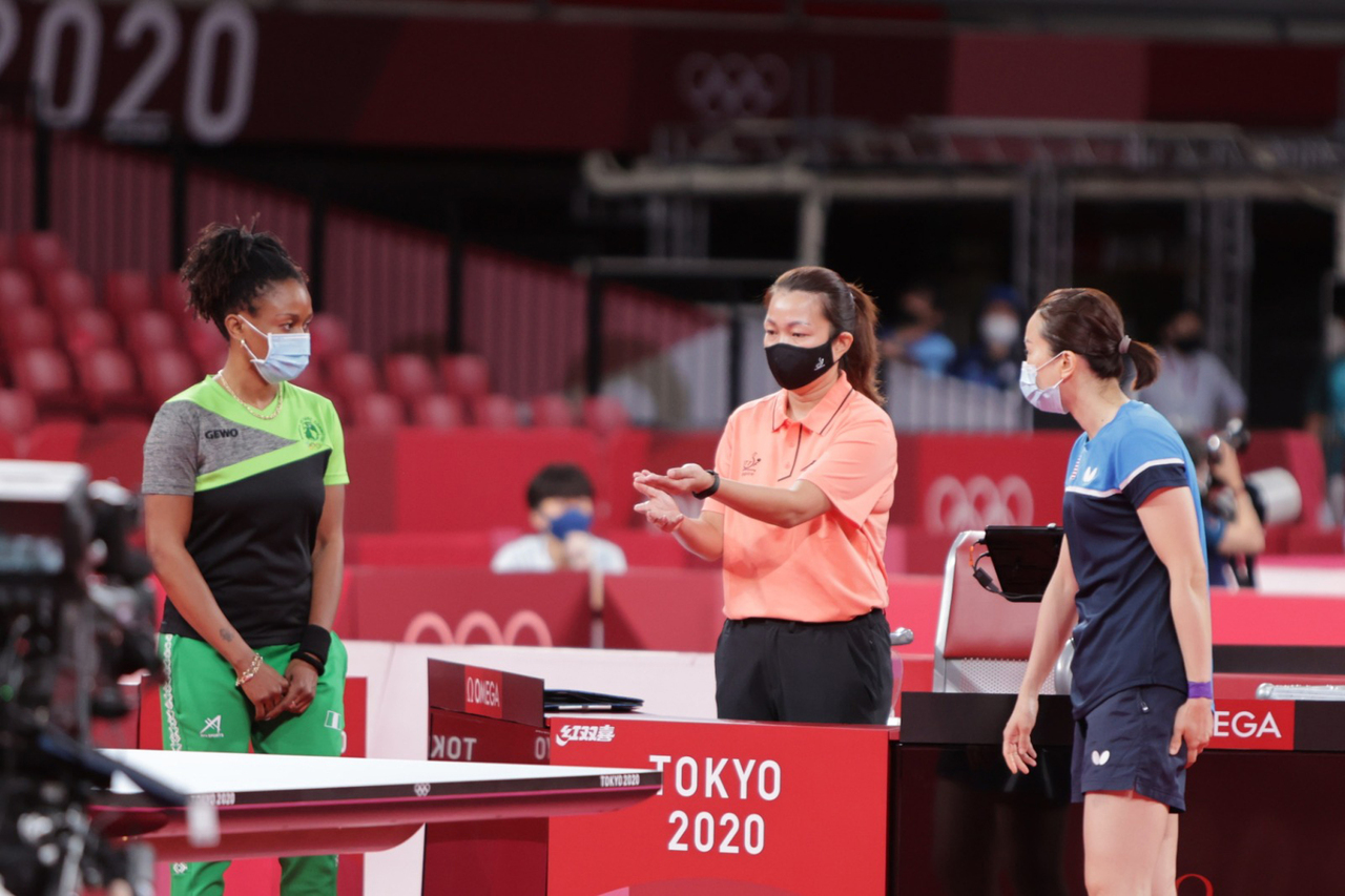 Christabel Koh (centre) is at her first Summer Games where she is a table tennis umpire.