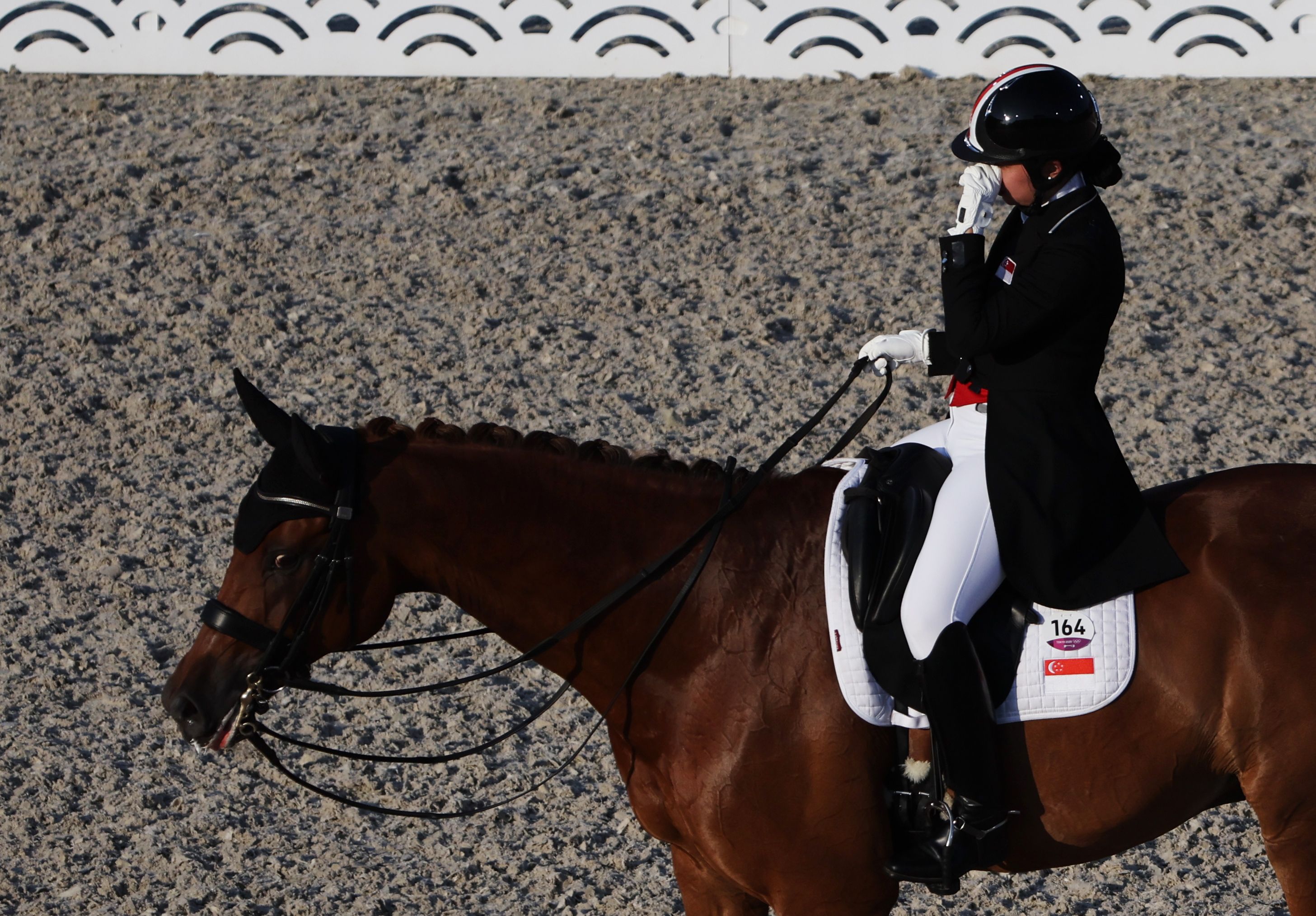 The Singapore National Olympic Council (SNOC) said that she was eliminated in accordance with International Federation for Equestrian Sports (FEI) dressage rules article 430.7.6.1, which states: If the Judge at C suspects fresh blood anywhere on the Horse during the test, he will stop the horse to check for blood. If the Horse shows fresh blood, it will be eliminated. The elimination is final. If the Judge through examination clarifies that the Horse has no fresh blood, the Horse may resume and finish its test.