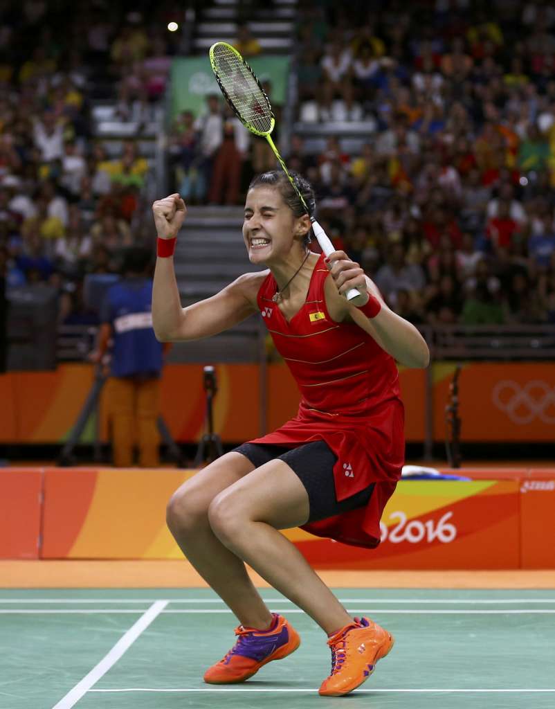 The top seed, known as the "Rafa Nadal" of badminton in Spain for her tenacity and fierce left-handed game, closed out a 19-21 21-12 21-15 victory over the 21-year-old Sindhu who was majestic in her Olympic debut.