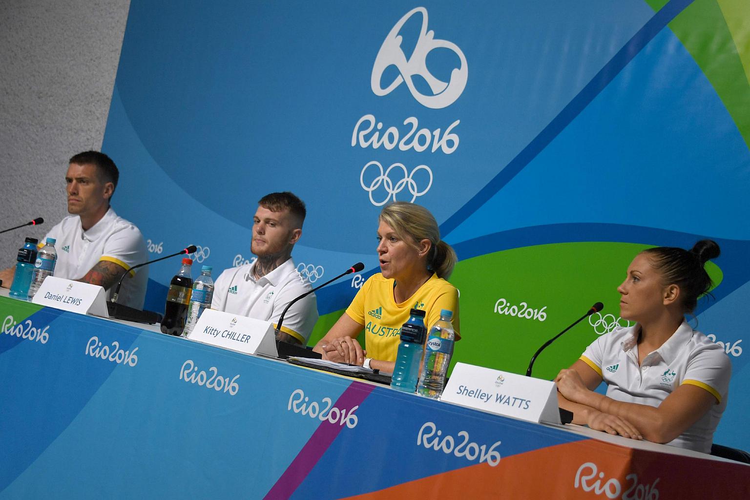 The Chef de Mission for Australia at the 2016 Rio Olympic Games, Kitty Chiller (center), with athletes Jason Whateley (left), Daniel Lewis (second, left) and Shelley Watts (right) at a press conference on July 25.