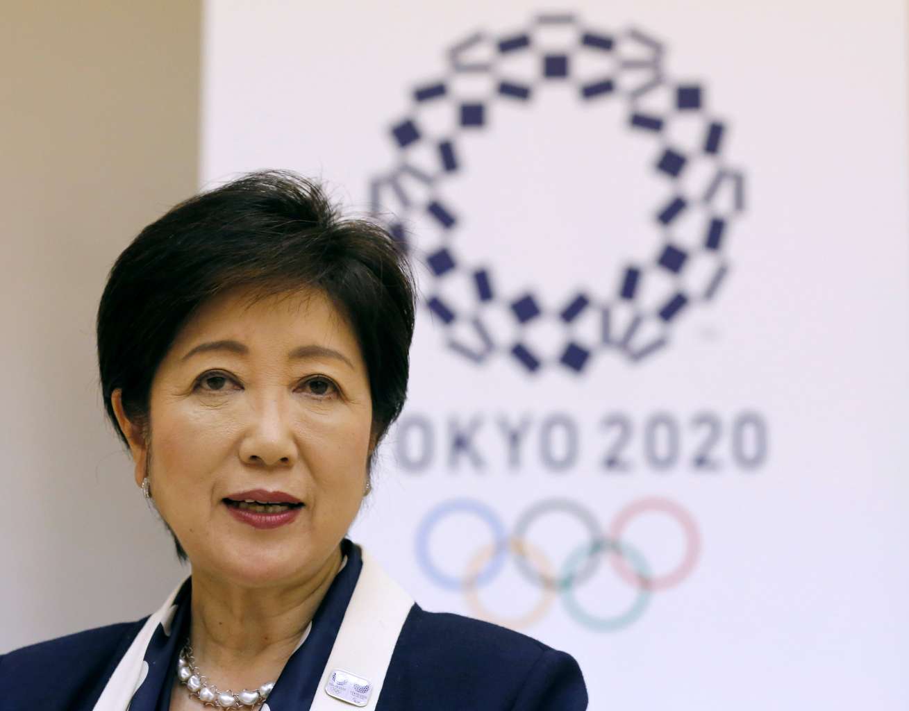 Tokyo Governor Yuriko Koike speaks in front of Tokyo 2020 Olympics emblem during an interview with Reuters at Tokyo Metropolitan Government Building in Tokyo on Oct 12, 2016.