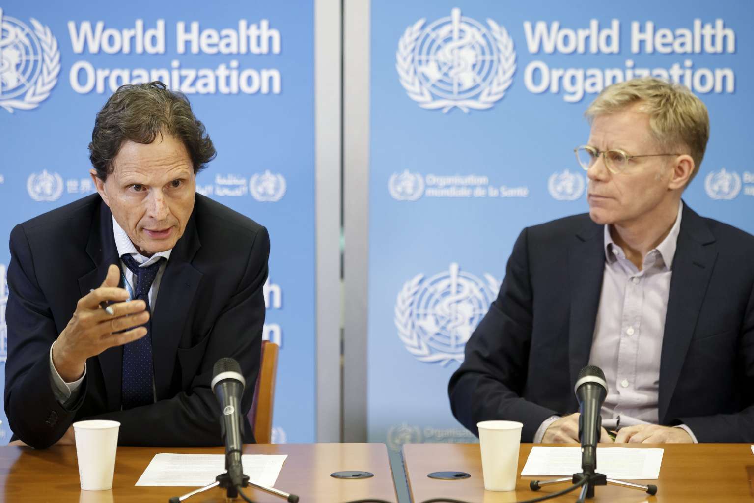 David Heymann (left), Chair of the World Health Organization (WHO) Emergency Committee on Zika, and Bruce Aylward (right), Executive Director ad interim of the Outbreaks and Health Emergencies Cluster of WHO, speak to the media on June 14, 2016.