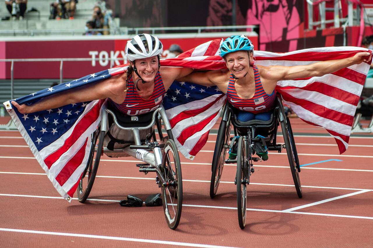 USA's Tatyana McFadden (left) and Susannah Scaroni celebrate after the women's 5000m - T53/54 at the Tokyo 2020 Paralympic Games, on Aug 28, 2021.