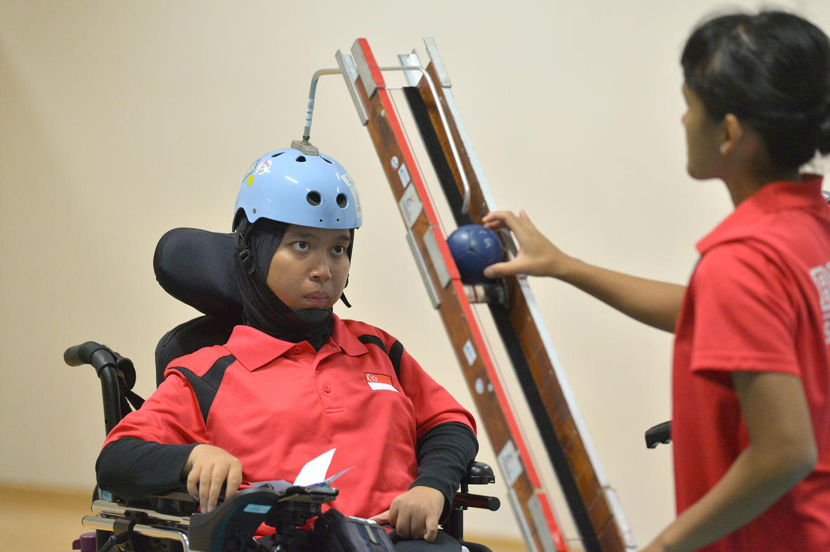 Boccia uses four sport classes: BC1 to BC4. Nurulasyiqah and Toh are under the BC3 classification, which include athletes with significantly limited function in their arms and legs, and poor or no trunk control. Assistive devices, including a ramp, helps them propel the ball onto the court.