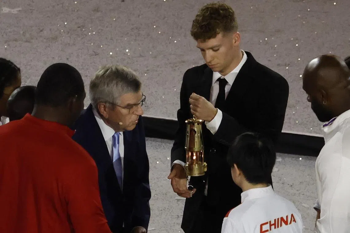 IOC president Thomas Bach (left) and French swimmer Leon Marchand blow out the Olympic flame during the Paris 2024 closing ceremony.