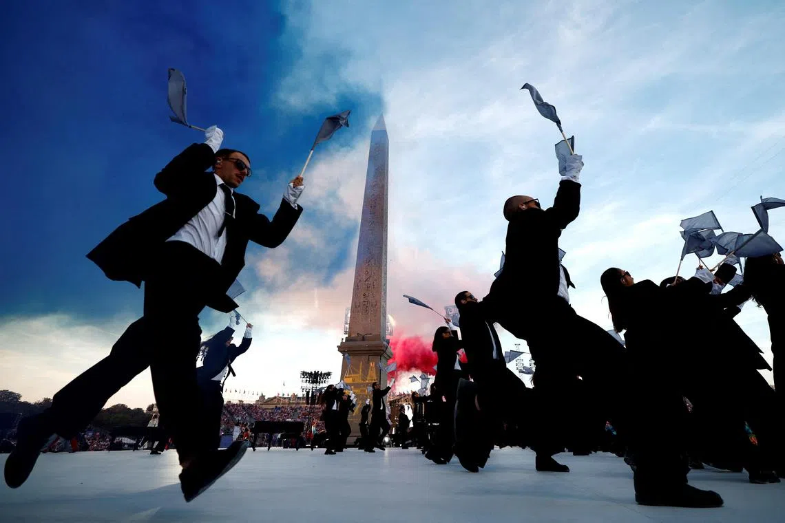 Performers during the opening ceremony near the Obelisk of Luxor on Paris’ Place de la Concorde.