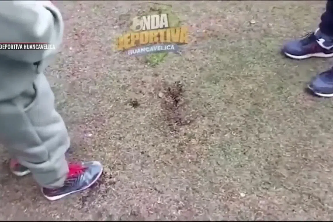 In video footage of the incident broadcast by local TV station Onda Deportiva Huancavelic, football players can be seen walking on the pitch in the 22nd minute of a match between local teams Juventud Bellavista and Familia Chocca.
