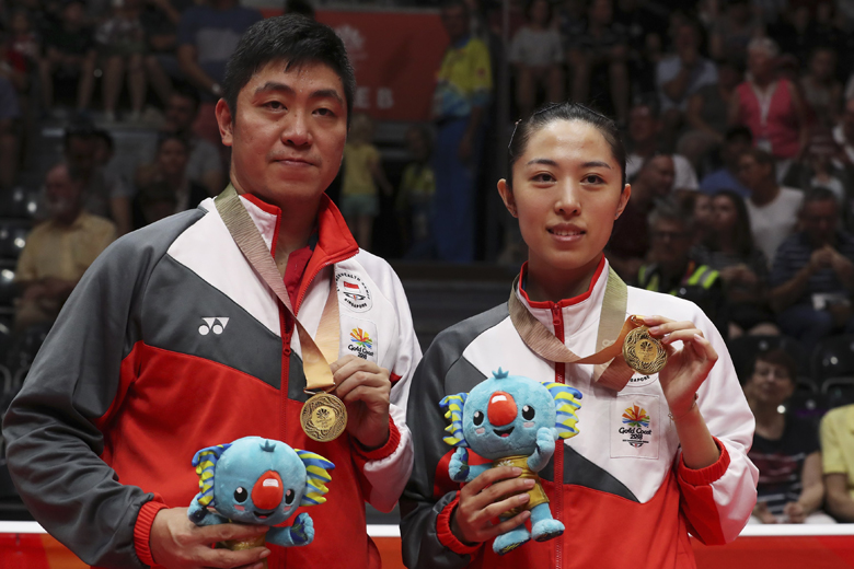 Singapore's table tennis players Gao Ning and Yu Mengyu pose with their Commonwealth Games gold medals in Gold Coast on April 15, 2018.