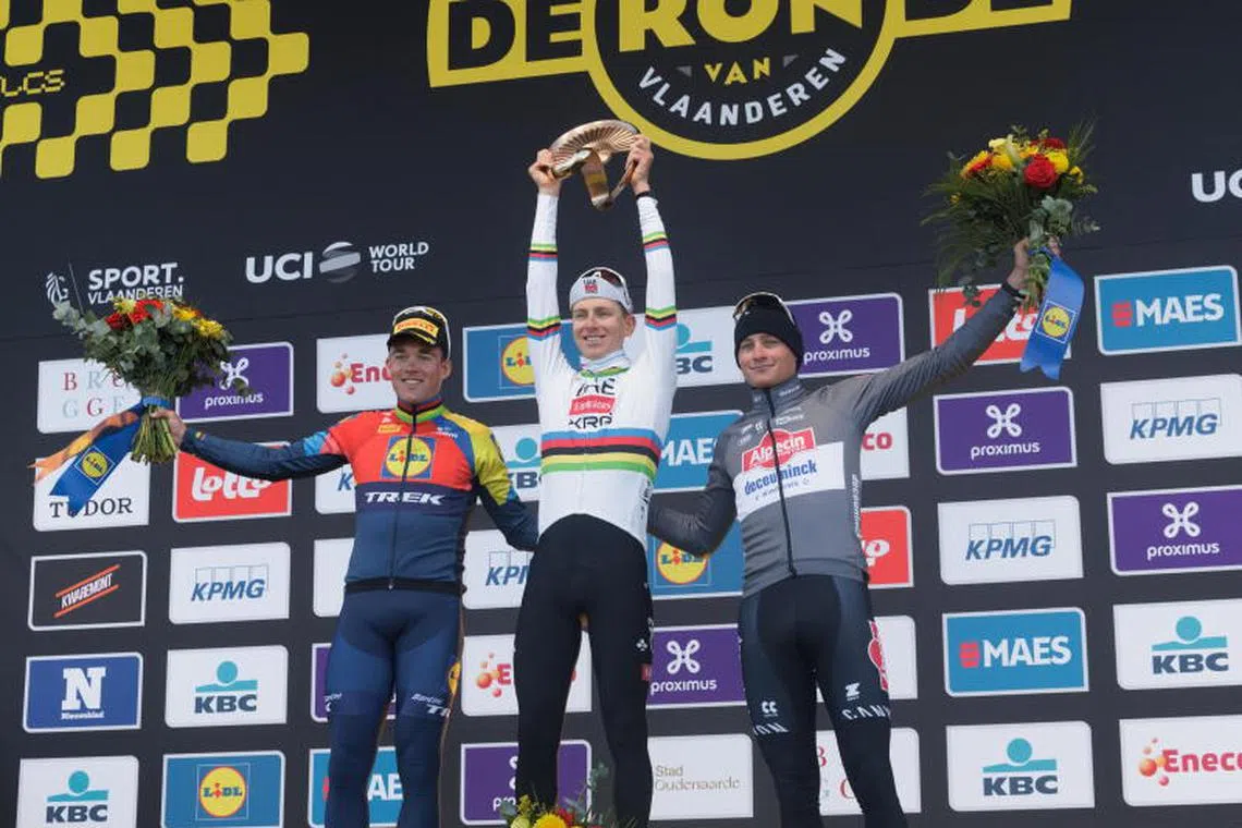 OUDENAARDE – Tadej Pogacar paid tribute to his team after he won an epic showdown at the Tour of Flanders on April 6, with Mads Pedersen edging out Mathieu van der Poel to second a minute later and Wout van Aert fourth.