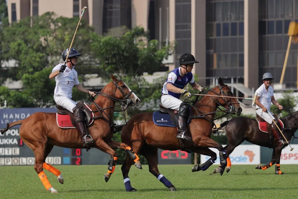 Decked in a dark blue and white uniform, Prince Harry, (centre) the Duke of Sussex, participated in a polo match to raise funds for charity Sentebale, held at the Singapore Polo Club on Aug 12.