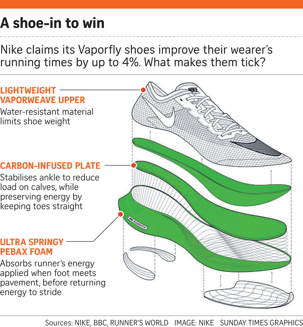 Nike promises improving times of up to 4 per cent. Over the course of a 2hr 10min marathon, that is a difference of more than five minutes. The five fastest official marathons of all time have come in the shoes, all within the last two years.