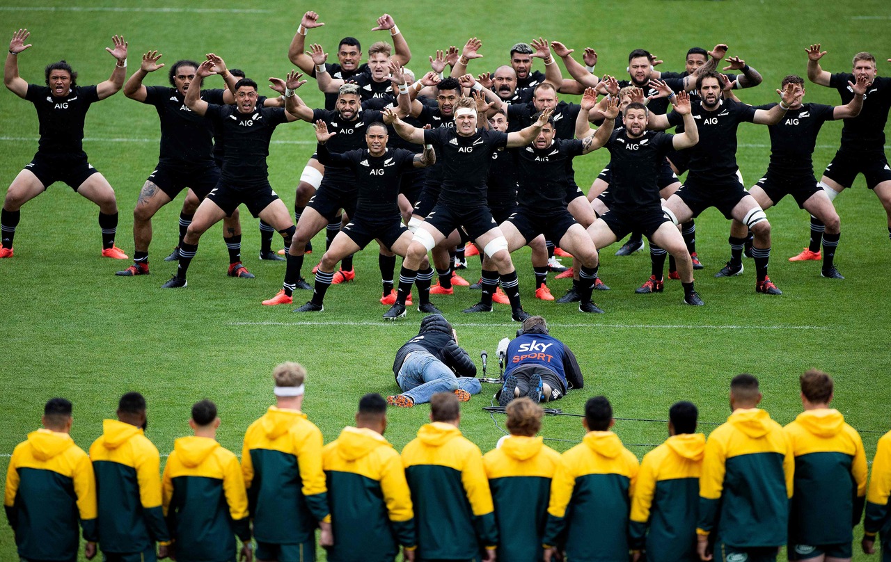 New Zealand players perform the haka before the start of the Bledisloe Cup rugby union match in Wellington, on Oct 11, 2020.