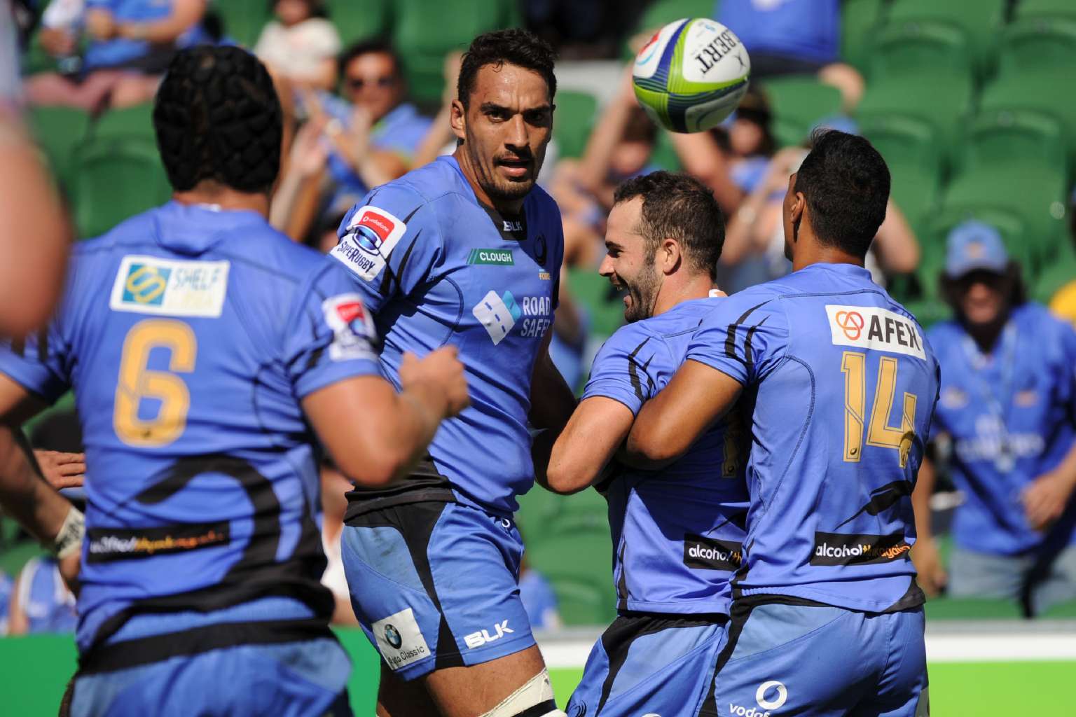 Western Force's players celebrate the team's first try during the Super Rugby match against South Africa's Kings in Perth on April 9.