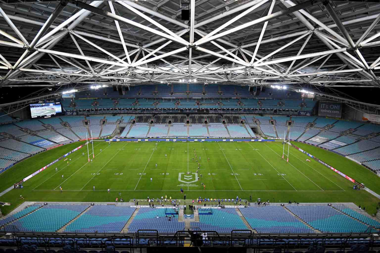 General view of players in action during the Australian National Rugby League at ANZ Stadium in Sydney, Australia, on March 19, 2020.