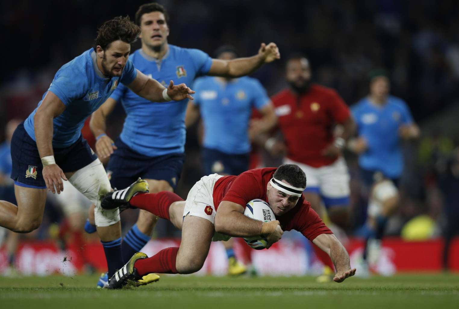 France's Guilhem Guirado (right) dives for the line but falls just short, in an attack that eventually leads to France's first try.