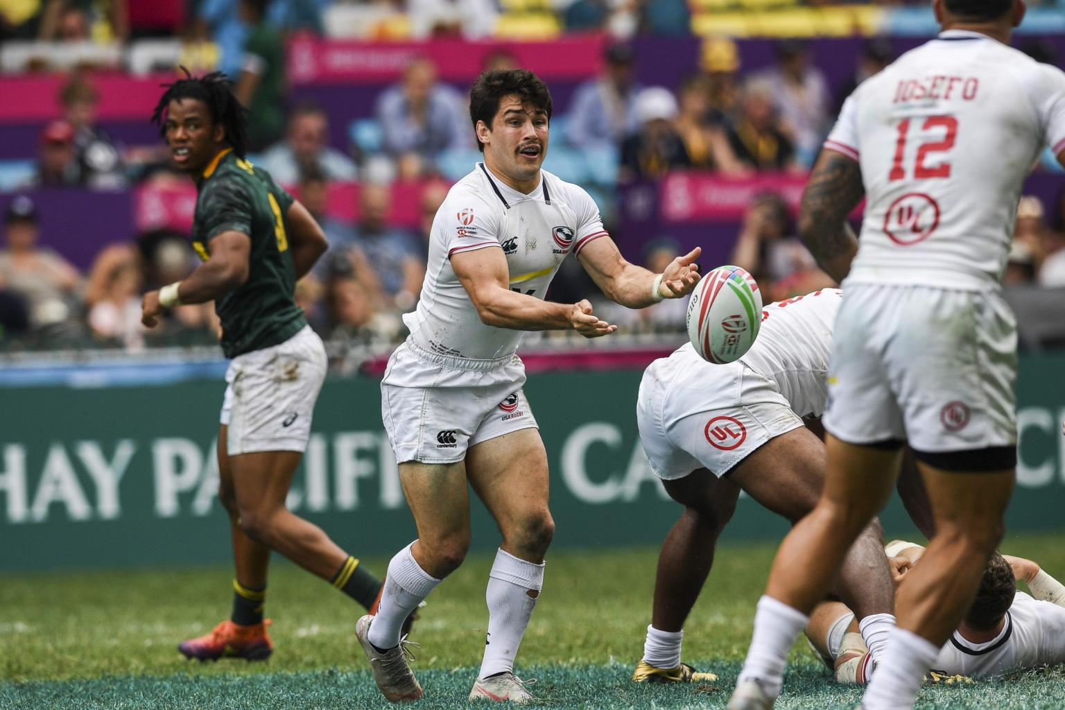 Madison Hughes (centre) of the United States in action against South Africa on the third day of the Hong Kong Sevens rugby tournament on April 7, 2019.