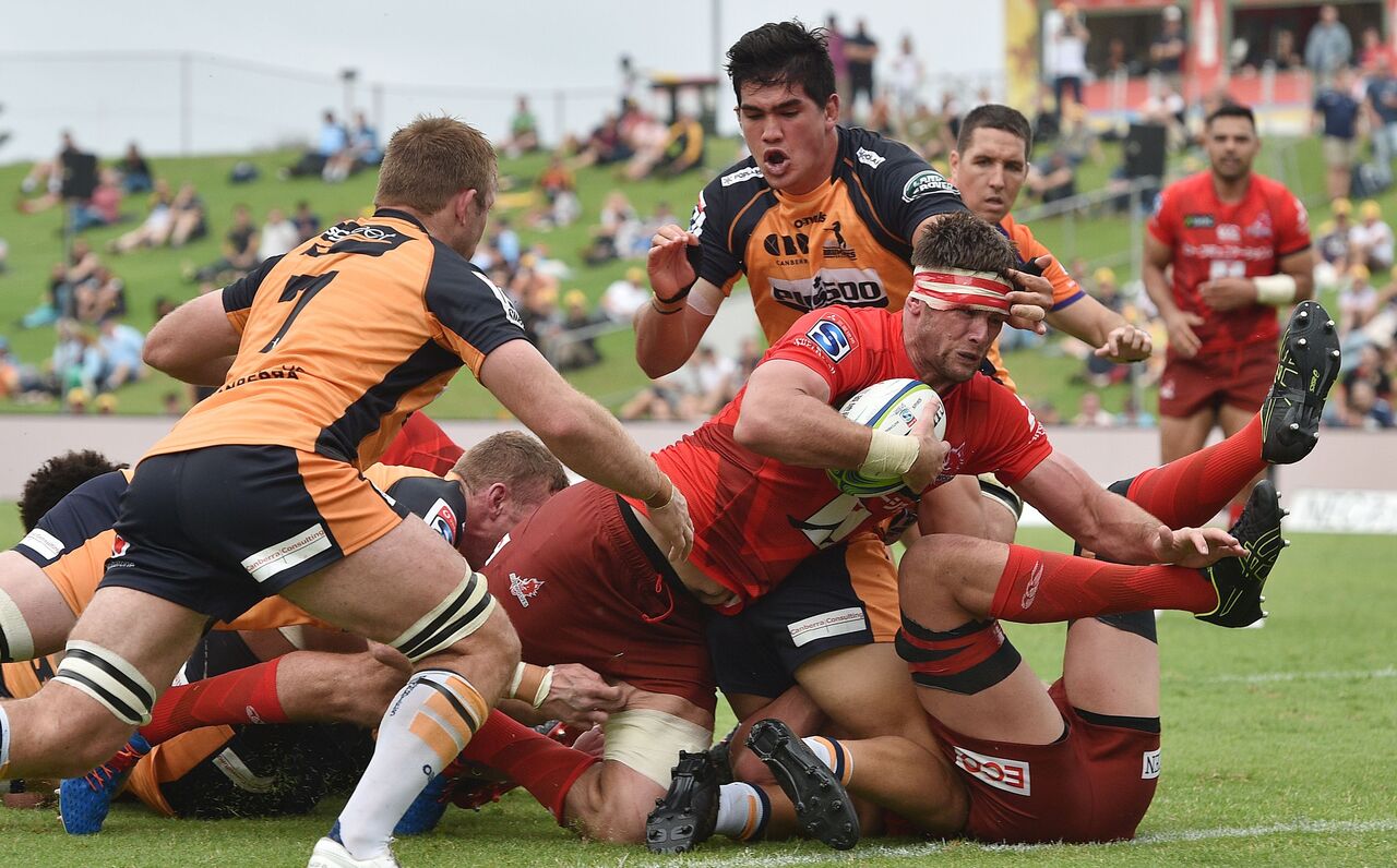 Sunwolves player Michael Stolberg (centre) scoring a try in Woolongong, Australia, March 6, 2020.