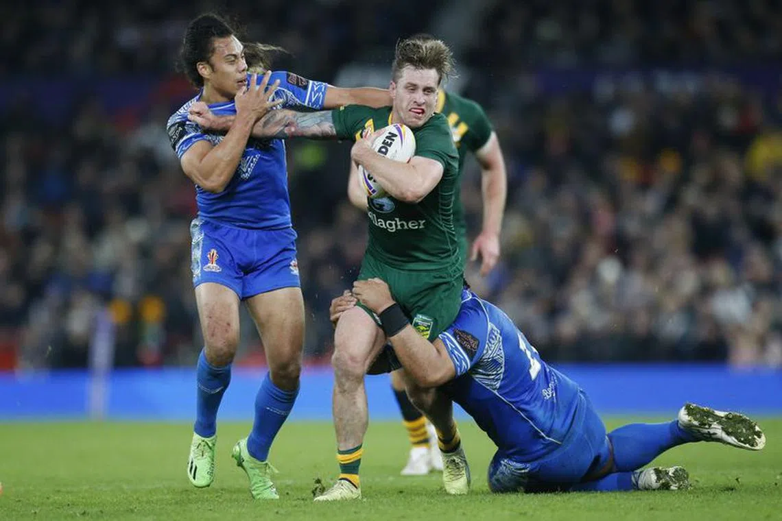 Rugby League - Men's World Cup Final - Australia v Samoa - Old Trafford, Manchester, Britain - November 19, 2022 Australia's Cameron Munster in action with Samoa's Jarome Luai Action Images via Reuters/Ed Sykes/ File photo