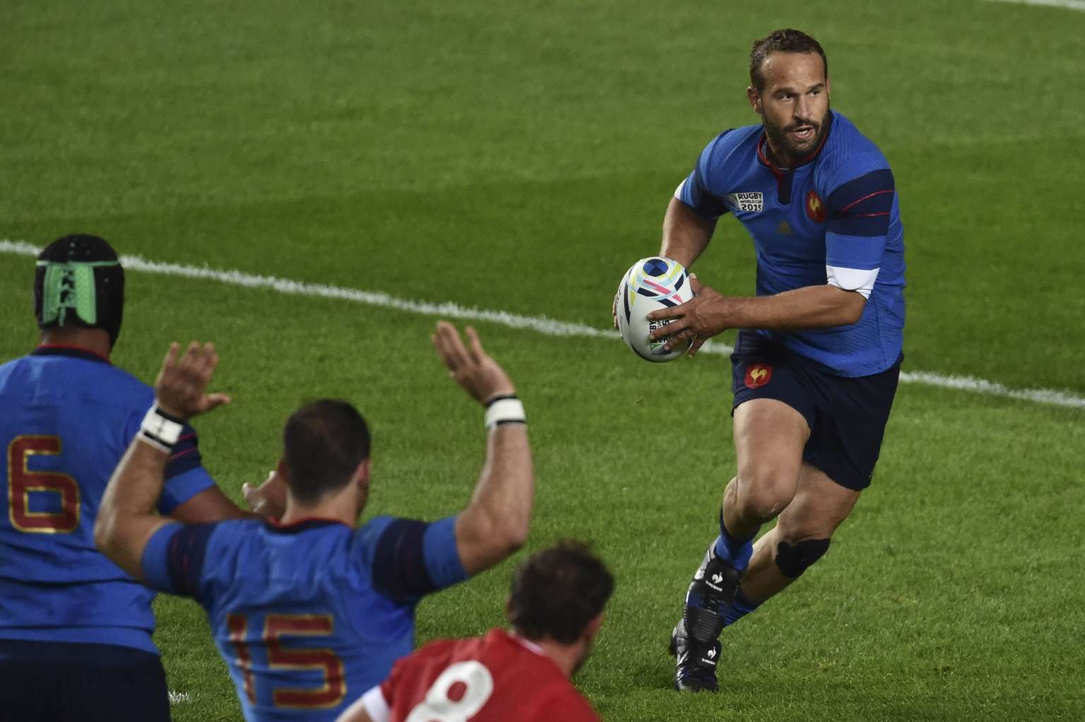 France's fly half Frederic Michalak (right) runs with the ball.