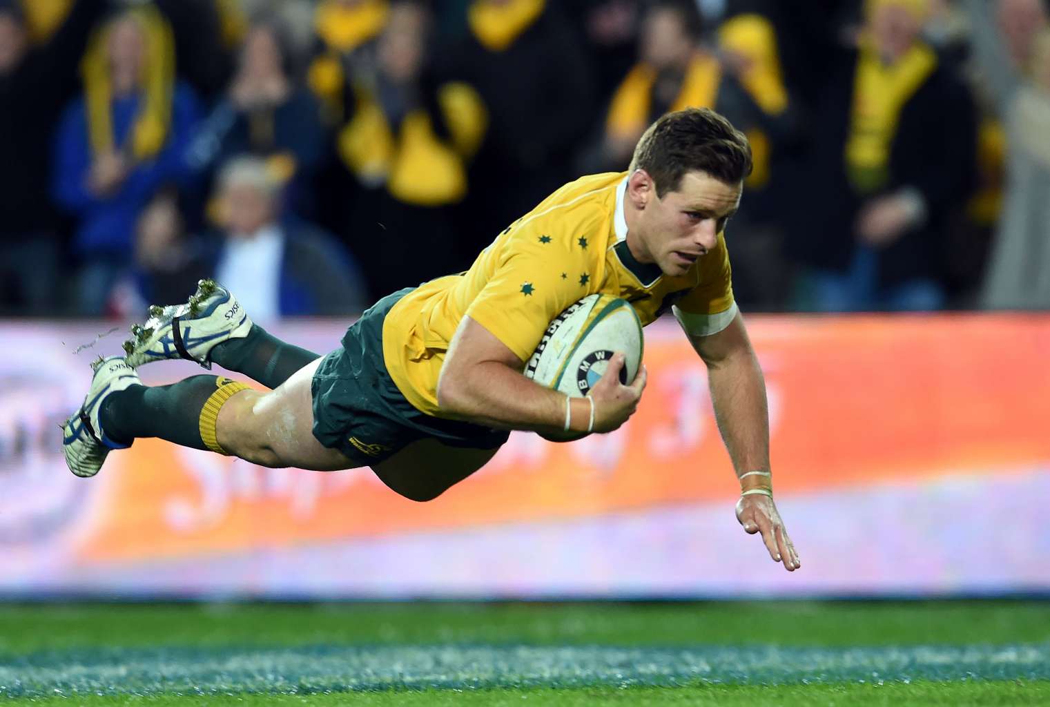 Australia's Bernard Foley dives for a successful try against England during their third and final rugby union Test in Sydney on June 25, 2016.