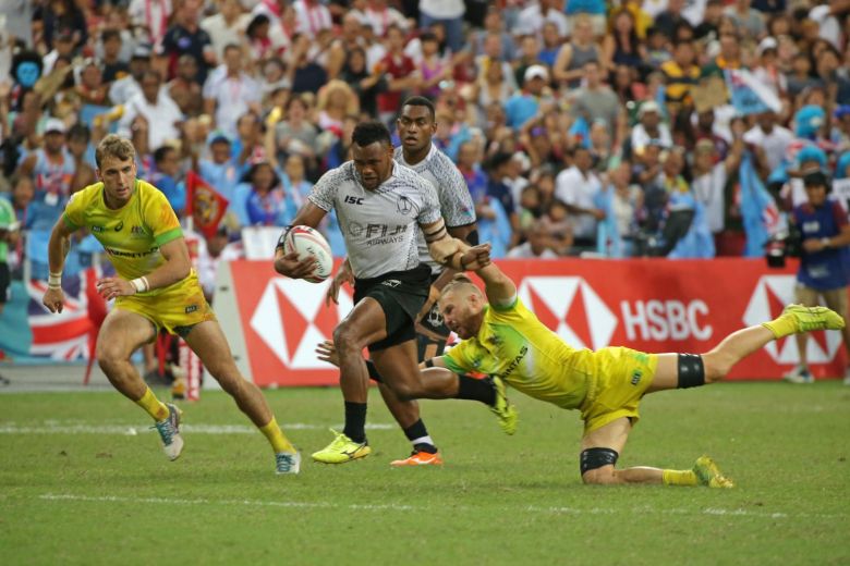 Fiji in action against Australia at the HSBC Singapore Sevens final held at the National Stadium in April 2018.