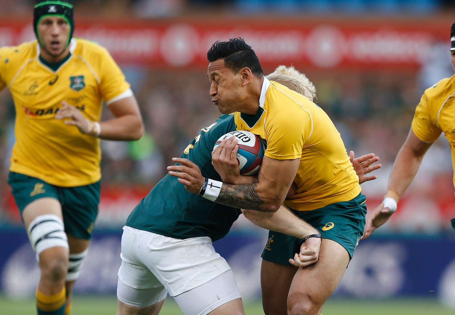 South African prop Vincent Koch (left) tackles Australian fullback Israel Folau (right).