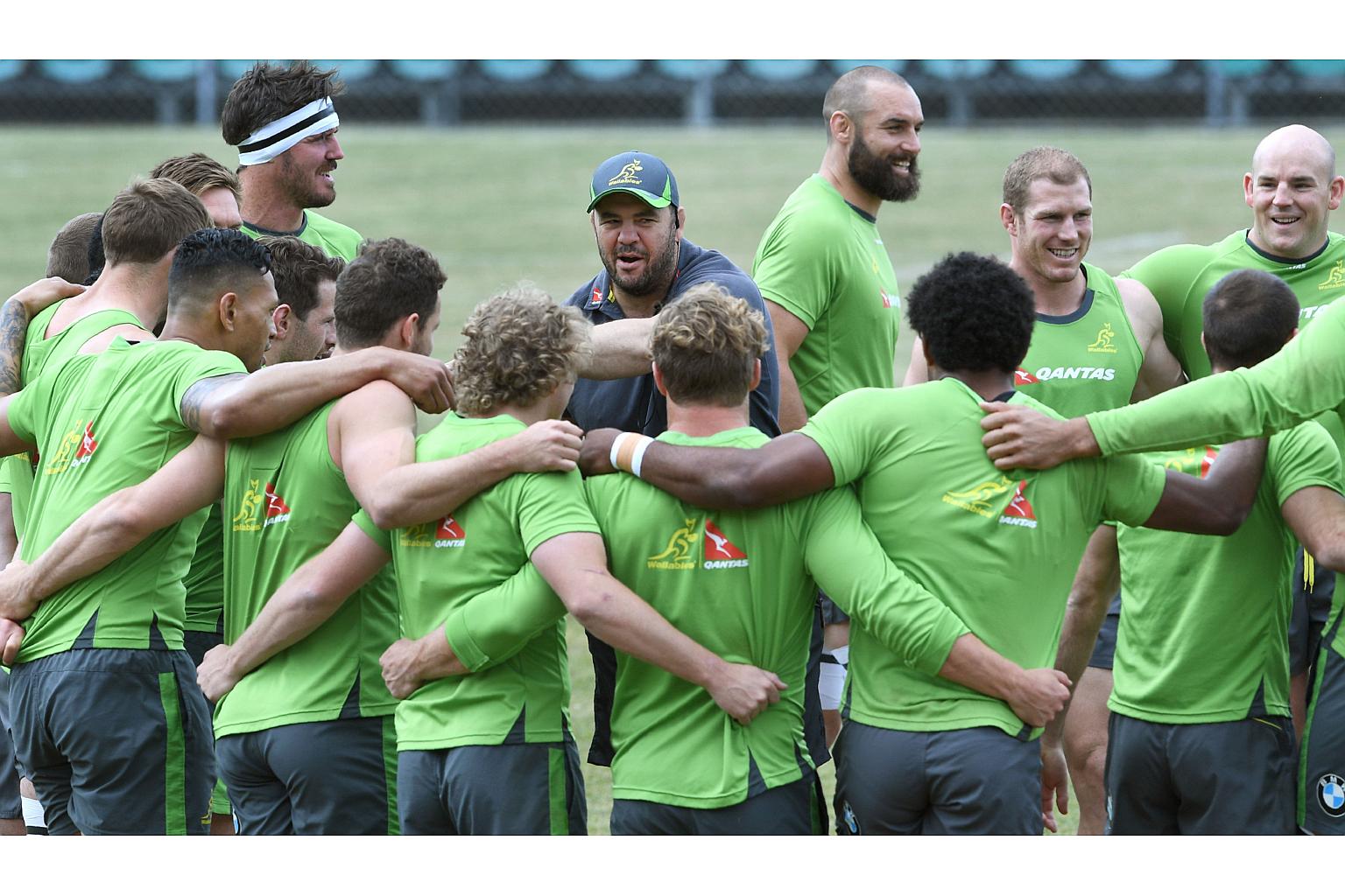 Australian Wallabies rugby coach Michael Cheika (centre) speaks to his players during a training session, in Sydney on Oct 20, 2016.