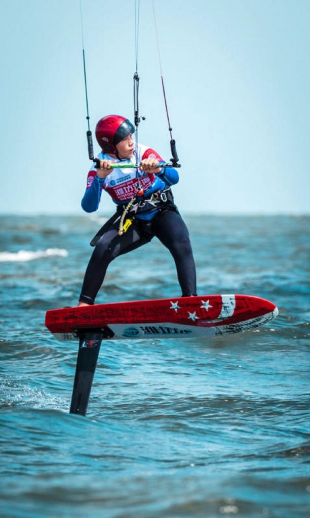 Singapore kiteboarder Maximilian Maeder, 12, in action at the 2018 KiteFoil GoldCup World Series in Weifang, China.