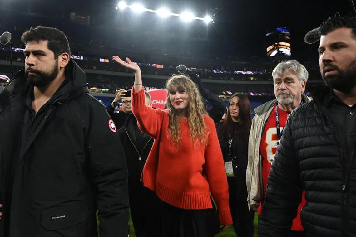 American singer-songwriter Taylor Swift (center) walks off the field after the Kansas City Chiefs won the AFC Championship football game.