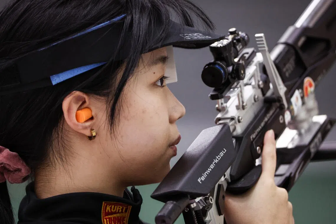 Natanya Tan in action during the women’s 10m air rifle finals at the National Sports Training Center in Hanoi on May 16, 2022.