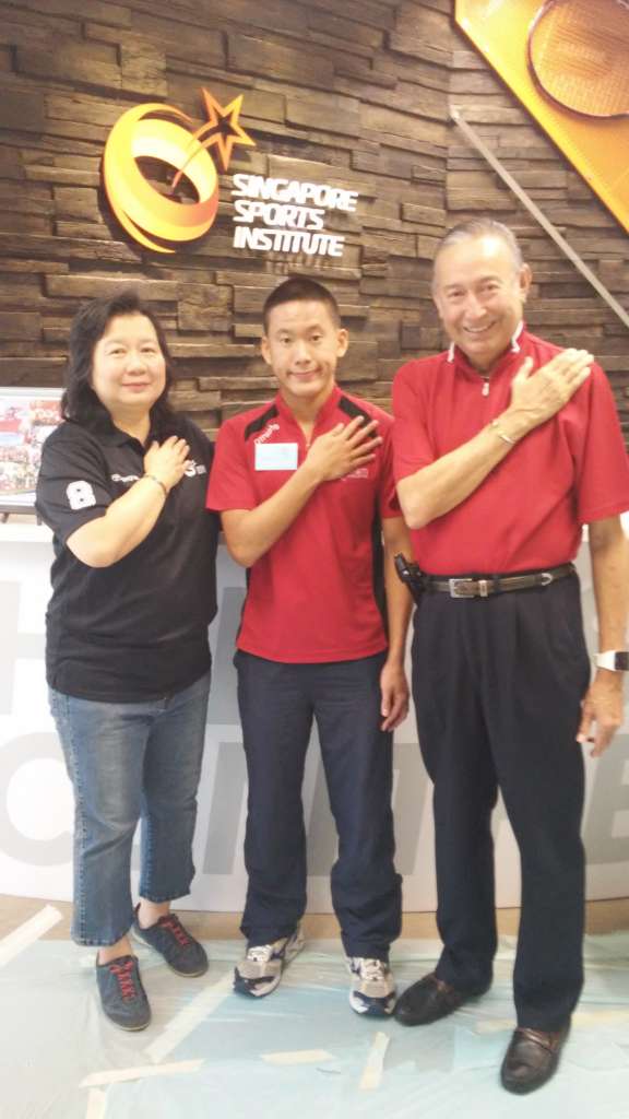 Singapore para-swimmer Benson Tan (centre) with Colin and May Schooling, parents of Olympic gold medallist Joseph Schooling.