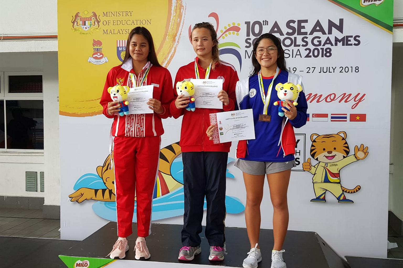 Singapore's Elena Pedersen (centre) posing on the podium with Indonesia's Lestari Dewi Novita (left) and Samantha Coronel of the Philippines after she won the 100m backstroke gold at the Asean Schools Games on July 24, 2018.