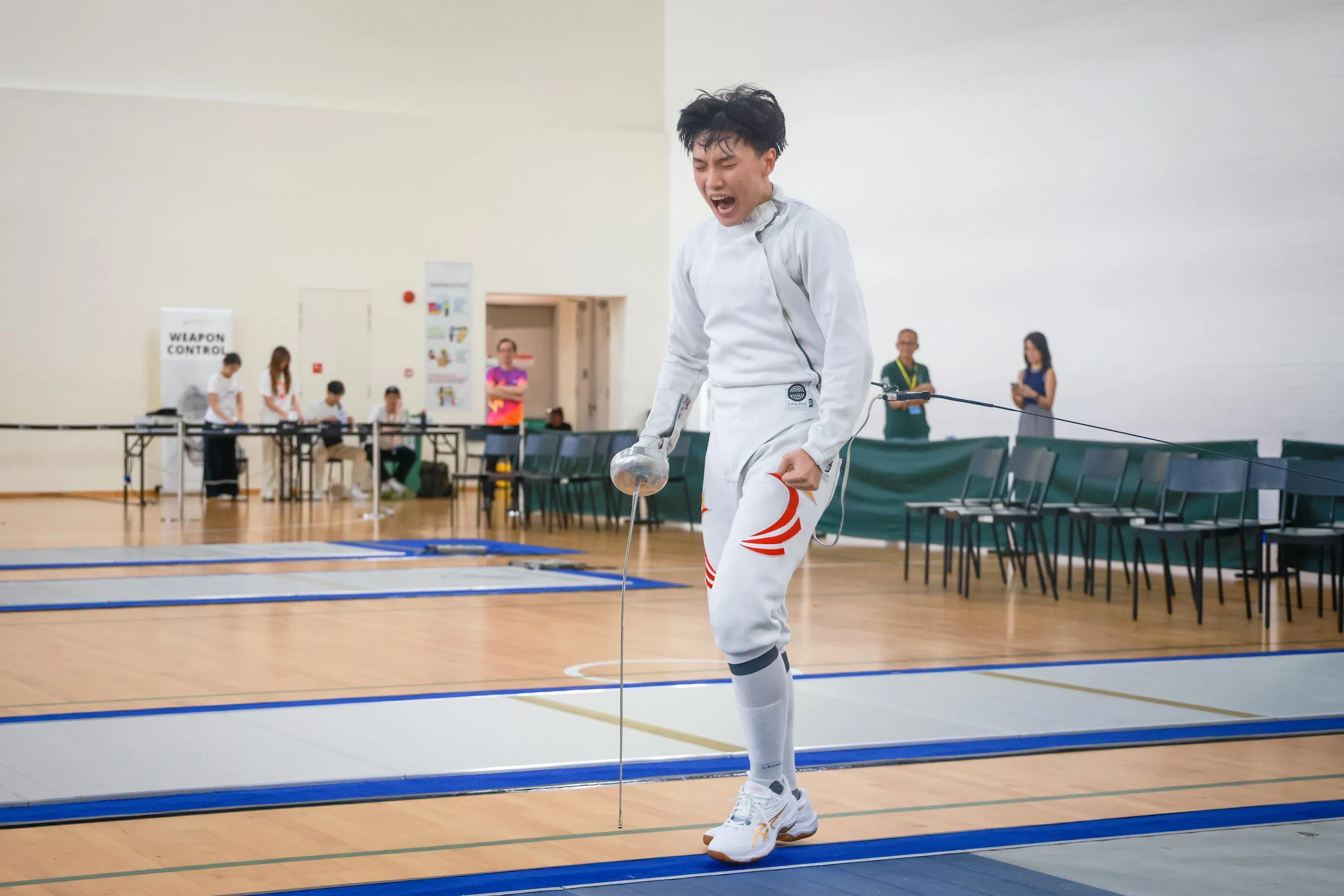 Lucas Wang, of Hwa Chong Institution, celebrates after defeating Nathaniel Chan, of Raffles Institution, in the B Division boys’ epee final at the OCBC Arena on April 23.