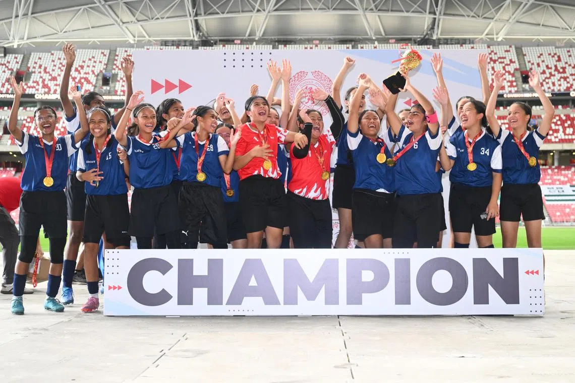 CBP W3, a combined team comprising players from Boon Lay Secondary, Methodist Girls’ School and Westwood Secondary, celebrate after winning the C Division girls’ football final against Meridian Secondary School 7-0 on Aug 13.